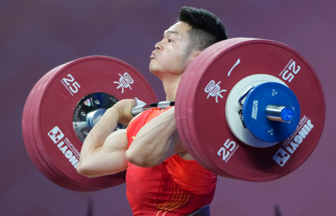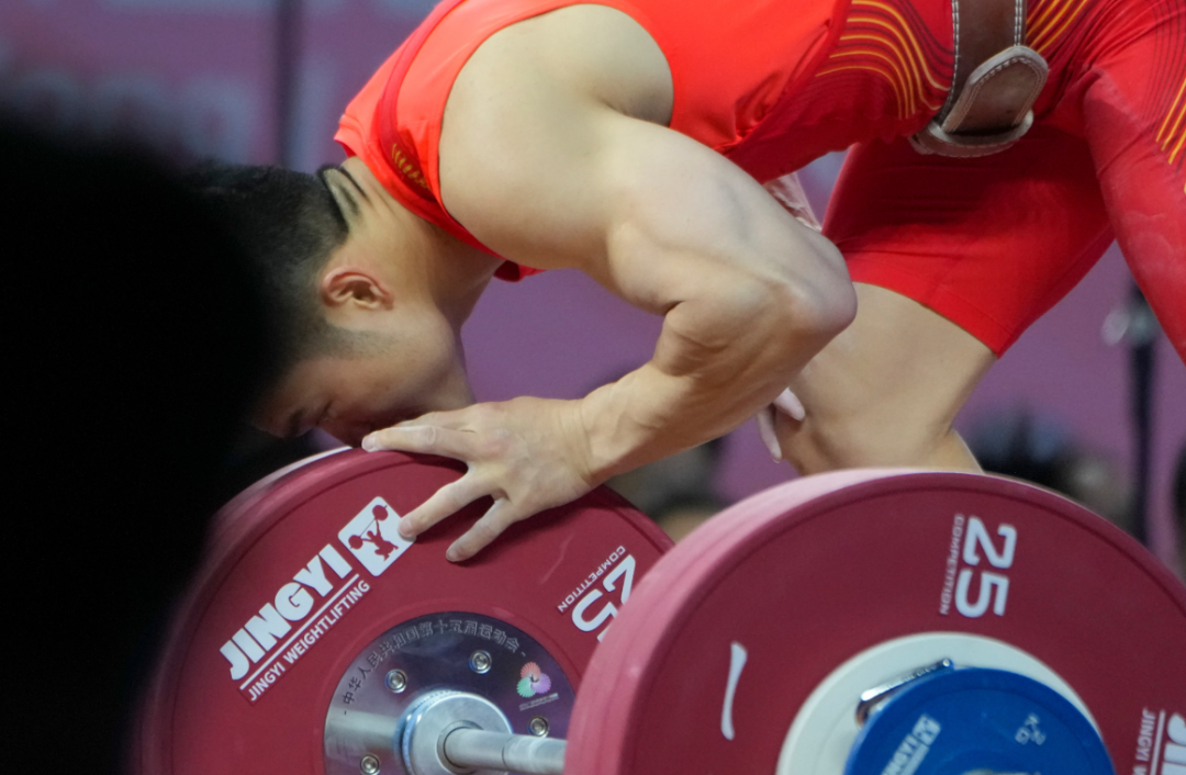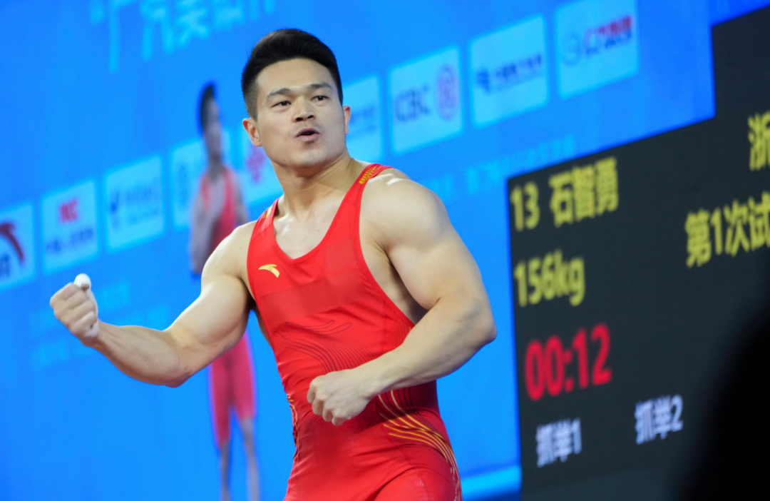 抓举阶段,石智勇在其他选手三次试举全部结束后才踏上赛场。他原计划以160公斤开把。观察场上形势后,他果断将开把重量下调至156公斤。伴随着现场观众的屏息注视,他一气呵成,稳稳举起杠铃。但这场比赛的激烈程度远超预期,抓举重量达到150公斤以上的选手多达7人。湖南队25岁的彭政林以155公斤暂列第二,紧追不舍。为了拉开差距,石智勇第二把直接挑战161公斤,凭借厚实的技术功底,再次顺利完成试举。第三把冲击164公斤时,石智勇的紧张肉眼可见,走上举重台前反复深呼吸。尽管拼尽全力,杠铃还是遗憾滑落。